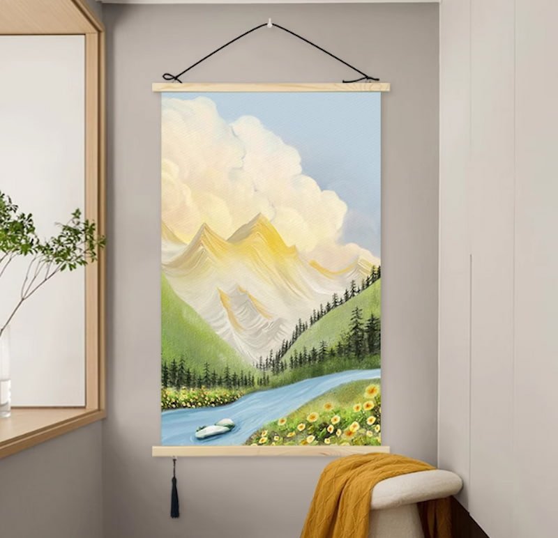 The wooden scroll frame with black tassels adds an artistic and elegant touch beyond the fresh, soothing Japanese manga aesthetic. Hanging it in your home feels like bringing the mountain’s brightness and tranquility indoors. Every glance at it offers a momentary escape from the hustle and bustle, immersing you in this secret landscape reminiscent of a manga scene, filling the room with healing and comfort.Bamboo scroll prints for sale, buy unique wall art print.