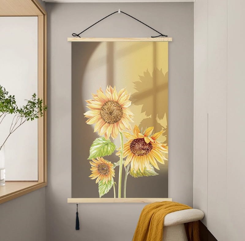 The wooden scroll frame with black tassels adds an artistic touch to this warm and soothing piece. Hanging it in your home is like bringing a sun-drenched field and a gentle sunset into your life. Every time your gaze rests upon it, the golden floral hues and warm light will quietly dispel fatigue, infusing the space with radiance and vitality. It allows you to embrace the mindset of “chasing the light and growing toward the sun” in your daily life.Bamboo scroll print for sale, buy unique wall art prints.
